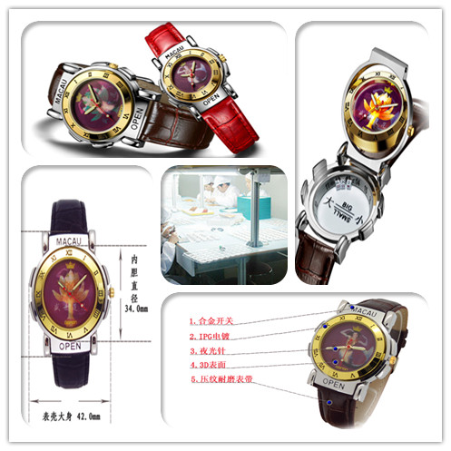 這款澳門表是一款帶有賭博功能的手表。小小的手表包含了多個個性設(shè)計。骰子、羅盤以及澳門的標(biāo)志圖案。這款個性禮品賭博手表是有禮品手表工廠以澳門特色為靈感專業(yè)設(shè)計的,并且申請專利進行保護。