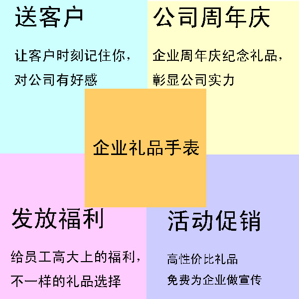 我們送禮給客戶首先是要讓客戶記住我們,這是最主要的也是最重要的,說白了,送禮就是一種宣傳廣告。讓客戶在需要與我們公司相關(guān)的產(chǎn)品的時候能夠第一時間想到我們;第二,宣傳企業(yè)文化和公司產(chǎn)品;發(fā)放員工福利讓人覺得我們公司高大上等等,這幾點禮品手表定制完全可以達到你想要的效果。
